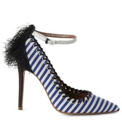 Zapatos que atraerán más de una mirada (y envidia) por sus mezclas de plumas con estampados de rayas marineras; stilettos con pulsera al tobillo; inspiraciones marineras y unas sandalias color block mezcladas con un talón de plumas para darle a tu look un aire más glam y rockero.